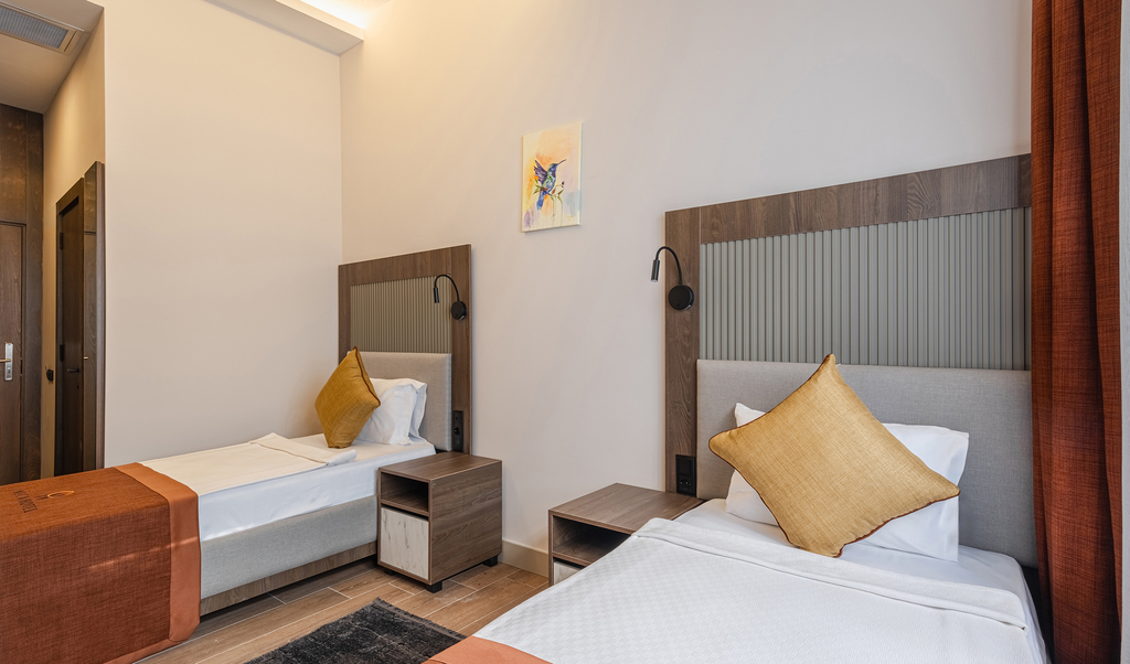 Konfor ve şıklığı bir arada sunan Standart Twin Oda, iki ayrı yatak seçeneğiyle rahat bir konaklama imkânı sağlar.